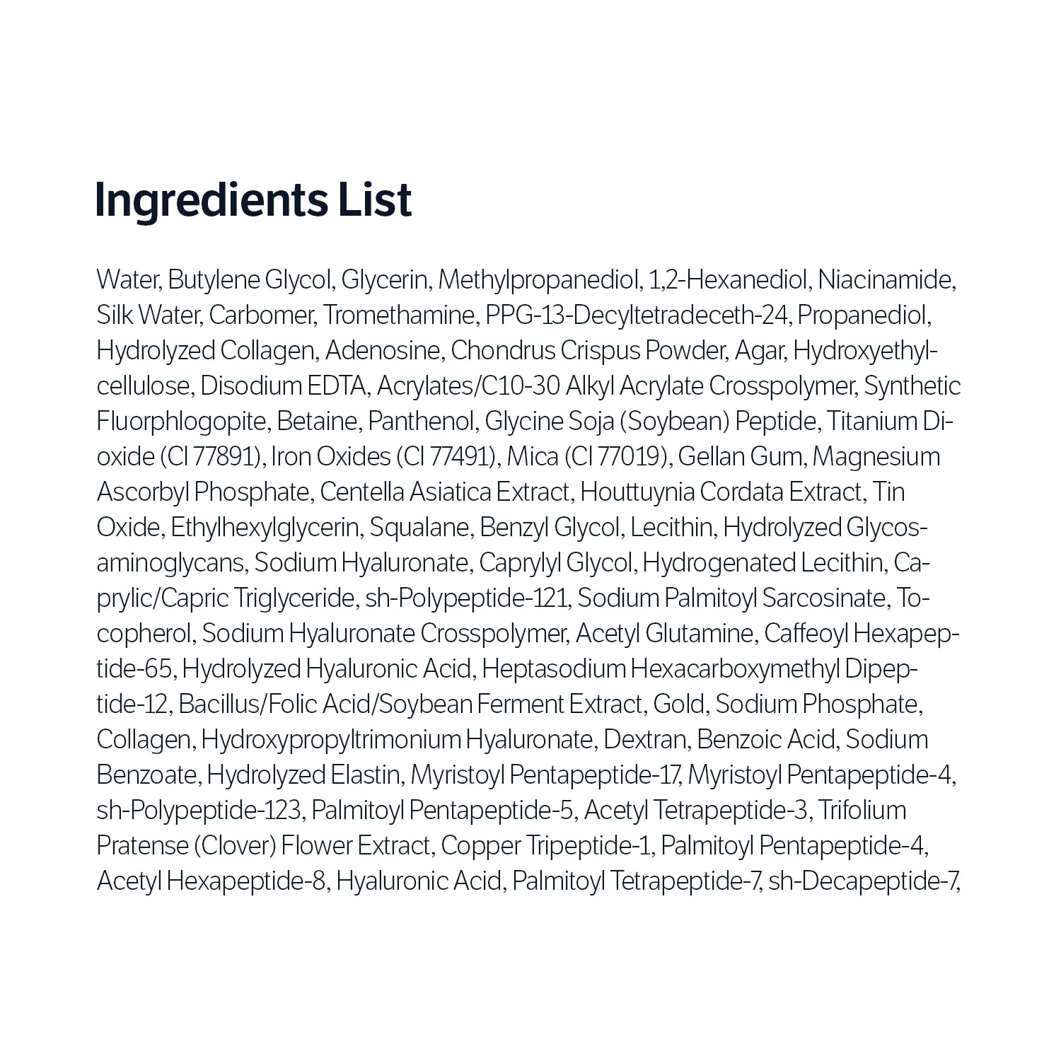 - Human-friendly Silk peptide that is high in absorption and Gold Line Collagen that helps skin with tight lifting energy.