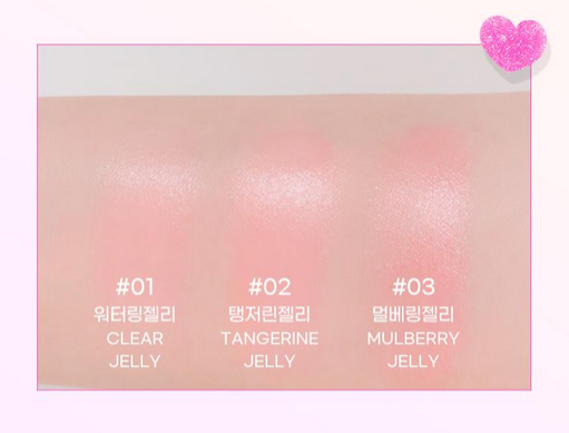 - #01 Clear Jelly: Appears clear but transforms into a pink shade upon contact with skin.