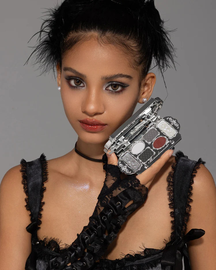 Let your eyes take center stage with Black Swan. A bold mix of cool whites, smoky gray, and deep red, with metallic silver shimmers for a striking, mysterious look.
