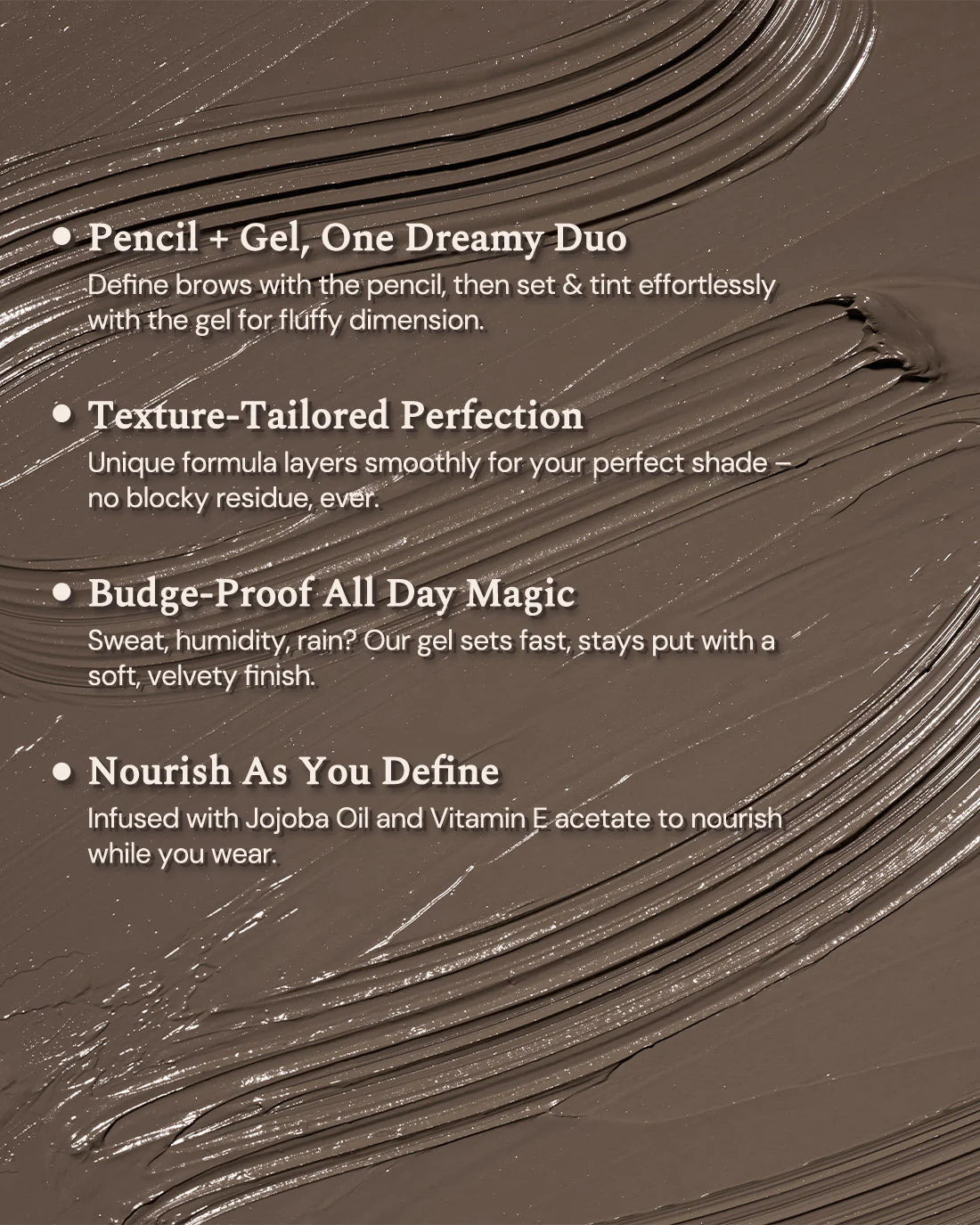Define brows with the pencil, then set & tint effortlessly with the gel for fluffy dimension.