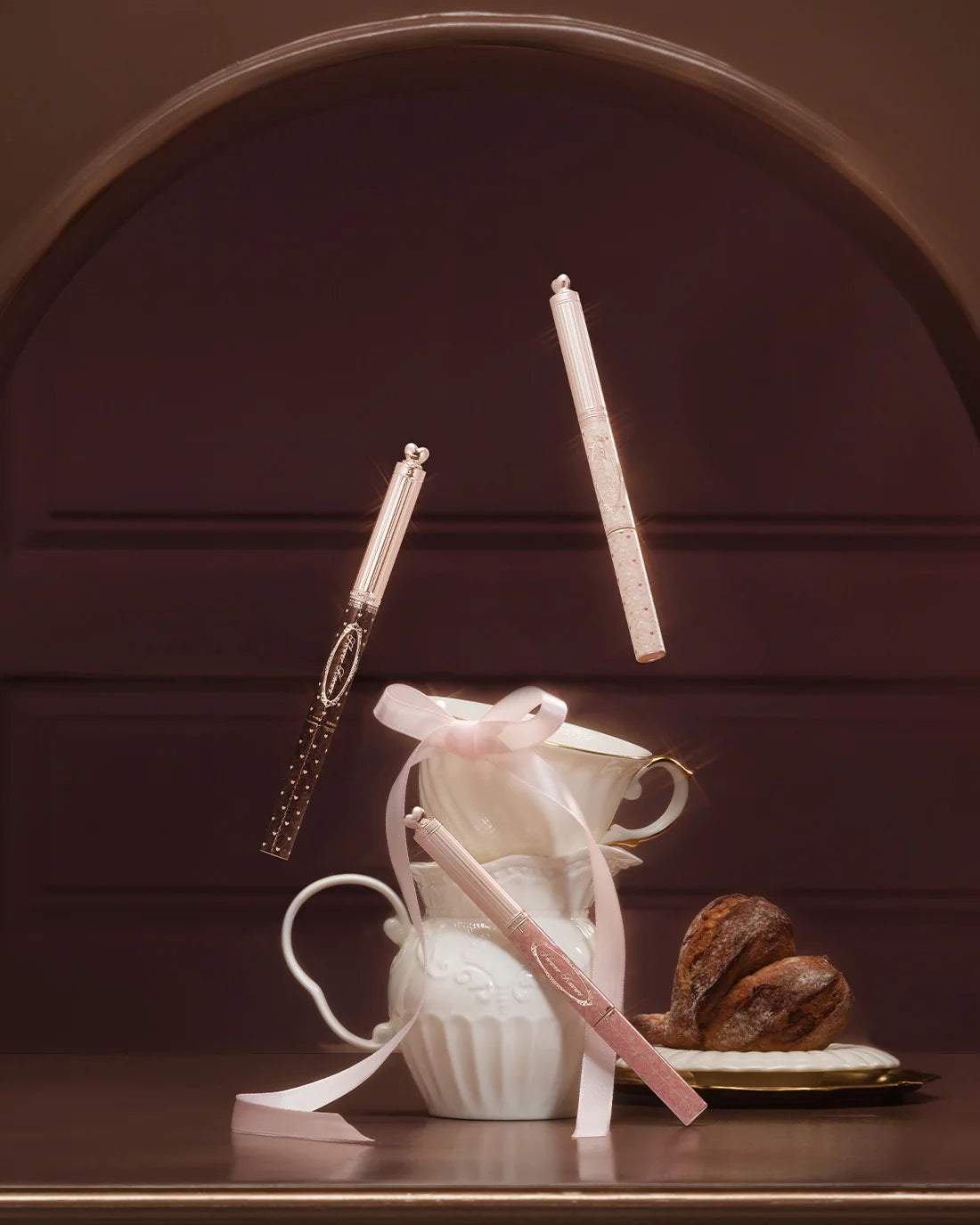 The pen sparkles with a gilded cap and playful heart polka dots in candy colors.