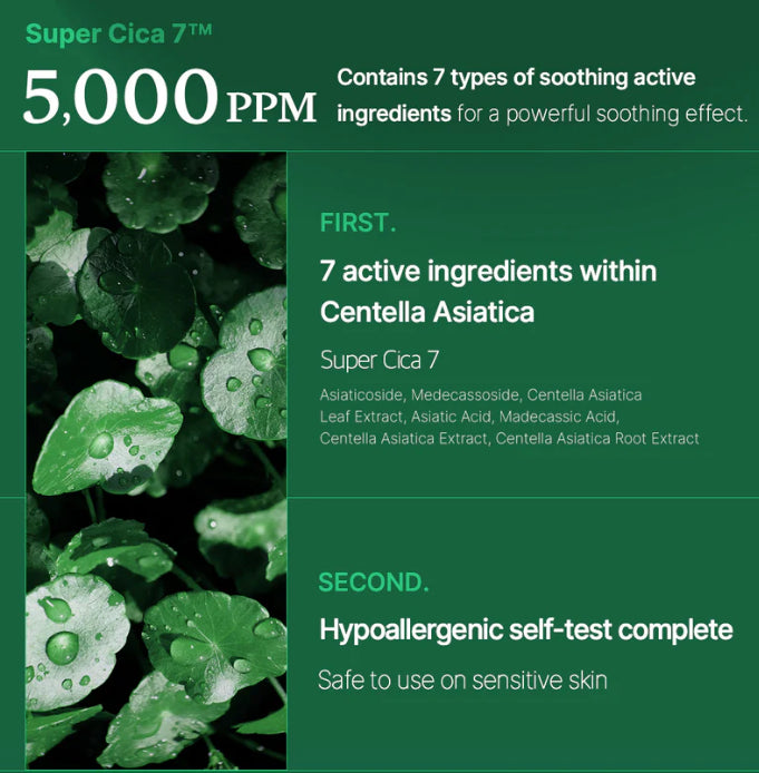 We filled it with 7 active cica ingredients to achieve perfect soothing with only 1 sheet. (Asiaticoside, Medecassoside, Centella Asiatica Leaf Extract, Asiatic Acid, Madecassic Acid, Centella Asiatica Extract, Centella Asiatica Root Extract)