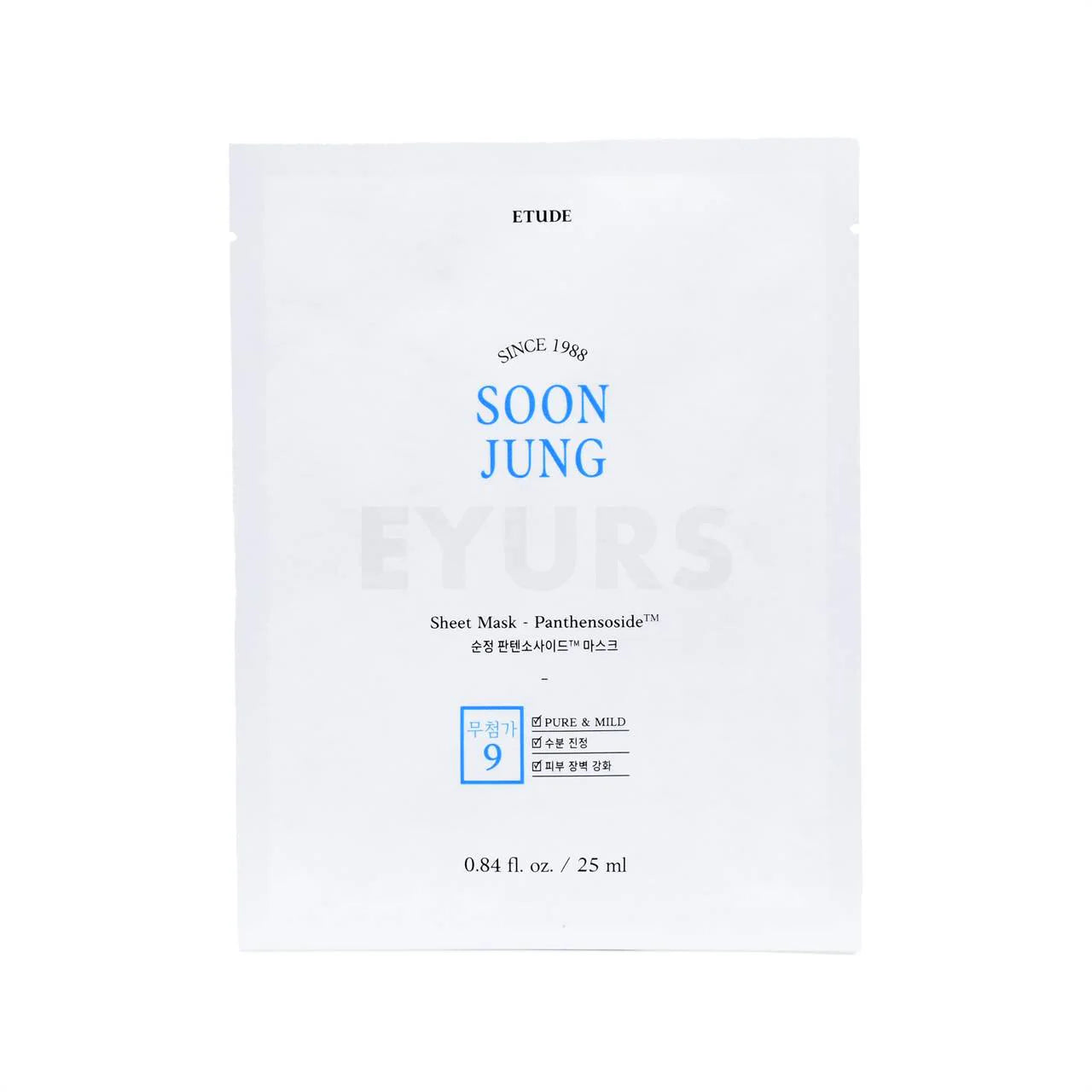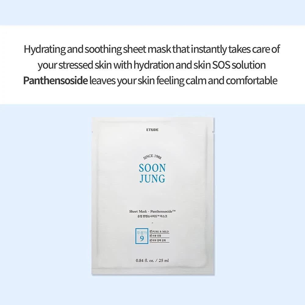 • Soon Jung Panthensoside Sheet Mask by ETUDE is a dermatologically tested and allergy tested hydrating soothing face mask that contains panthenol, madecassoside, and centella asiatica leaf extract.