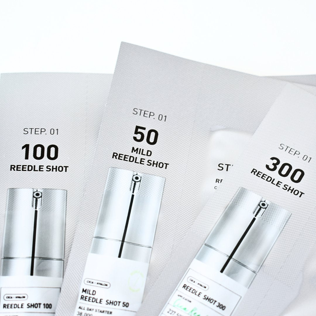 Mild Reedle Shot 50 Essence - formulated with CICA Reedles to refine and smooth skin. Penetrates deeply for micro-needling effects and improves texture with Centella Asiatica Extract, Triple Hyaluronic Acid, Centella 4X Complex, and Green Propolis Extract. Address a variety of skincare concerns and nourish skin. Quick absorption and natural rejuvenation.