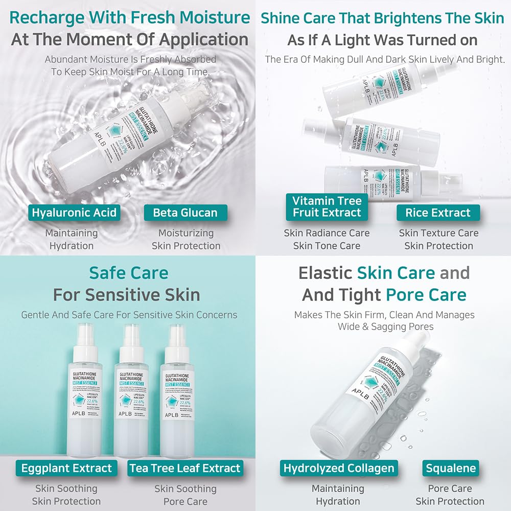 Enriched with glutathione, niacinamide and centella asiatica, this mist essence replenishes moisture in skin while delivering brightening effects. It contains hydrolyzed collagen and squalane to boost skin hydration and provide anti-aging effects. Suitable for various skin types including sensitive skin.