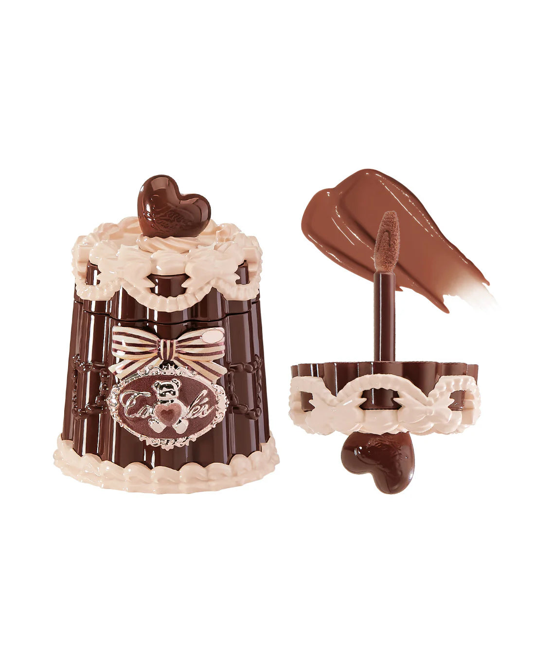 A chubby heart-shaped chocolate sits atop the caramel-like shell, gleaming with a tempting luster under the light.