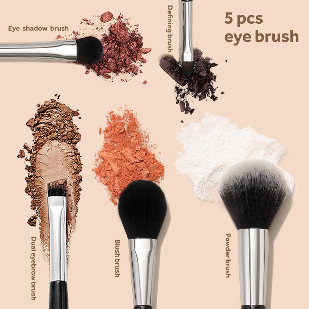 Includes: Powder, Blush, Eyeshadow, Blending, and Dual Eyebrow brushes.