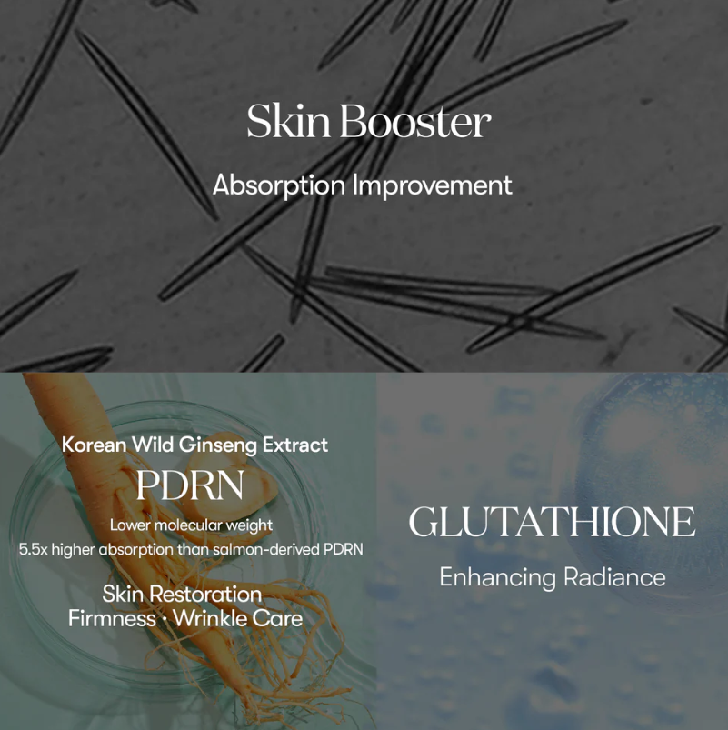 Vegan PDRN :Our PDRN essence is uniquely sourced from Korean ginseng, providing a distinctive ingredient choice, rather than the commonly used fish derivatives.