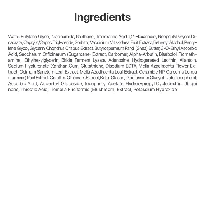 [KEY INGREDIENTS] Contains antioxidants and tone-evening ingredients glutathione, vitamin C, niacinamide and tranexamic acid to help gently yet effectively fade hyperpigmentation and darks spots and even out dull, uneven skin tone. Panthenol and ceramides for soothing and hydration.