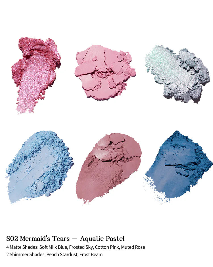 01 Moonlight Pearl #1: Calcium Aluminum Borosilicate, Octyldodecanol, Synthetic Fluorphlogopite, Polysorbate 60, Silica, Caprylyl Glycol, Mica, Ethylcellulose, Tin Oxide, Ethylhexylglycerin, Chlorphenesin, Gellan Gum, Water, Squalane, Potassium Chloride, Xanthan Gum, Tocopheryl Acetate, Titanium Dioxide(Ci 77891), Iron Oxides(Ci 77491) #2: Mica, Silica, Synthetic Wax, Dimethicone, Nylon-12, Magnesium Myristate, Caprylic/Capric Triglyceride, Triethoxycaprylylsilane, Trimethylsiloxysilicate, Phenoxyethanol, Caprylyl Glycol, Tocopheryl Acetate, Ethylhexylglycerin, Titanium Dioxide(Ci 77891), Iron Oxides(Ci 77491), Iron Oxides(Ci 77499), Ultramarines(Ci 77007) #3: Calcium Aluminum Borosilicate, Octyldodecanol, Synthetic Fluorphlogopite, Polysorbate 60, Mica, Silica, Caprylyl Glycol, Ethylcellulose, Tin Oxide, Ethylhexylglycerin, Chlorphenesin, Gellan Gum, Water, Squalane, Potassium Chloride, Tocopheryl Acetate, Titanium Dioxide(Ci 77891), Iron Oxides(Ci 77499) #4: Mica, Silica, Magnesium Myristate, Methyl Methacrylate Crosspolymer, Dimethicone, Caprylic/Capric Triglyceride, Triethoxycaprylylsilane, Trimethylsiloxysilicate, Phenoxyethanol, Caprylyl Glycol, Tocopheryl Acetate, Ethylhexylglycerin, Kaolin, Titanium Dioxide(Ci 77891), Manganese Violet(Ci 77742), Iron Oxides(Ci 77491), Iron Oxides(Ci 77499), Ultramarines(Ci 77007) #5: Mica, Silica, Synthetic Wax, Polymethylsilsesquioxane, Magnesium Myristate, Dimethicone, Polyisobutene, Isononyl Isononanoate, Caprylic/Capric Triglyceride, Triethoxycaprylylsilane, Phenoxyethanol, Caprylyl Glycol, Tocopheryl Acetate, Ethylhexylglycerin, Kaolin, Titanium Dioxide(Ci 77891), Iron Oxides(Ci 77499), Ultramarines(Ci 77007), Iron Oxides(Ci 77491), Manganese Violet(Ci 77742), Iron Oxides(Ci 77492) #6: Mica, Synthetic Wax, Dimethicone, Silica, Nylon-12, Caprylic/Capric Triglyceride, Trimethylsiloxysilicate, Phenoxyethanol, Triethoxycaprylylsilane, Caprylyl Glycol, Tocopheryl Acetate, Kaolin, Ethylhexylglycerin, Titanium Dioxide(Ci 77891), Manganese Violet(Ci 77742), Iron Oxides(Ci 77491), Iron Oxides(Ci 77499), Iron Oxides(Ci 77492) S02 Mermaid'S Tears #1: Calcium Sodium Borosilicate, Octyldodecanol, Synthetic Fluorphlogopite, Calcium Titanium Borosilicate, Polysorbate 60, Silica, Caprylyl Glycol, Ethylcellulose, Tin Oxide, Potassium Chloride, Ethylhexylglycerin, Chlorphenesin, Gellan Gum, Water, Squalane, Tocopheryl Acetate, Xanthan Gum, Titanium Dioxide(Ci 77891), Carmine(Ci 75470), Iron Oxides(Ci 77491) #2: Mica, Silica, Magnesium Myristate, Methyl Methacrylate Crosspolymer, Dimethicone, Synthetic Wax, Caprylic/Capric Triglyceride, Triethoxycaprylylsilane, Trimethylsiloxysilicate, Phenoxyethanol, Caprylyl Glycol, Tocopheryl Acetate, Ethylhexylglycerin, Kaolin, Titanium Dioxide(Ci 77891), Carmine(Ci 75470), Ultramarines(Ci 77007) #3: Octyldodecanol, Calcium Aluminum Borosilicate, Calcium Sodium Borosilicate, Synthetic Fluorphlogopite, Polysorbate 60, Silica, Caprylyl Glycol, Ethylcellulose, Tin Oxide, Potassium Chloride, Ethylhexylglycerin, Chlorphenesin, Gellan Gum, Water, Squalane, Tocopheryl Acetate, Xanthan Gum, Titanium Dioxide(Ci 77891), Ferric Ferrocyanide(Ci 77510) #4: Mica, Silica, Magnesium Myristate, Nylon-12, Dimethicone, Synthetic Wax, Caprylic/Capric Triglyceride, Triethoxycaprylylsilane, Trimethylsiloxysilicate, Phenoxyethanol, Caprylyl Glycol, Tocopheryl Acetate, Ethylhexylglycerin, Kaolin, Titanium Dioxide(Ci 77891), Ultramarines(Ci 77007), Blue 1 Lake(Ci 42090), Iron Oxides(Ci 77499) #5: Mica, Silica, Dimethicone, Nylon-12, Synthetic Wax, Magnesium Myristate, Caprylic/Capric Triglyceride, Aluminum Hydroxide, Polypropylene, Triethoxycaprylylsilane, Trimethylsiloxysilicate, Phenoxyethanol, Polymethylsilsesquioxane, Caprylyl Glycol, Tocopheryl Acetate, Ethylhexylglycerin, Kaolin, Titanium Dioxide(Ci 77891), Iron Oxides(Ci 77491), Red 30(Ci 73360), Ultramarines(Ci 77007), Iron Oxides(Ci 77499), Iron Oxides(Ci 77492) #6: Mica, Silica, Magnesium Myristate, Methyl Methacrylate Crosspolymer, Dimethicone, Triethoxycaprylylsilane, Caprylic/Capric Triglyceride, Trimethylsiloxysilicate, Phenoxyethanol, Caprylyl Glycol, Tocopheryl Acetate, Ethylhexylglycerin, Kaolin, Titanium Dioxide(Ci 77891), Ferric Ferrocyanide(Ci 77510), Manganese Violet(Ci 77742), Iron Oxides(Ci 77492) 03 Deep Sea #1:Octyldodecanol, Synthetic Fluorphlogopite, Calcium Aluminum Borosilicate, Calcium Titanium Borosilicate, Calcium Sodium Borosilicate, Polysorbate 60, Silica, Caprylyl Glycol, Ethylcellulose, Tin Oxide, Mica, Ethylhexylglycerin, Chlorphenesin, Gellan Gum, Water, Squalane, Potassium Chloride, Tocopheryl Acetate, Titanium Dioxide(Ci 77891), Iron Oxides(Ci 77491), Iron Oxides(Ci 77499) #2: Mica, Silica, Magnesium Myristate, Methyl Methacrylate Crosspolymer, Dimethicone, Synthetic Wax, Caprylic/Capric Triglyceride, Triethoxycaprylylsilane, Trimethylsiloxysilicate, Phenoxyethanol, Caprylyl Glycol, Tocopheryl Acetate, Ethylhexylglycerin, Kaolin, Titanium Dioxide(Ci 77891), Iron Oxides(Ci 77499), Ultramarines(Ci 77007), Iron Oxides(Ci 77492), Iron Oxides(Ci 77491) #3: Calcium Sodium Borosilicate, Octyldodecanol, Calcium Aluminum Borosilicate, Synthetic Fluorphlogopite, Polysorbate 60, Silica, Caprylyl Glycol, Ethylcellulose, Tin Oxide, Ethylhexylglycerin, Chlorphenesin, Gellan Gum, Water, Squalane, Potassium Chloride, Xanthan Gum, Tocopheryl Acetate, Titanium Dioxide(Ci 77891), Ferric Ferrocyanide(Ci 77510), Carmine(Ci 75470) #4: Mica, Magnesium Myristate, Silica, Methyl Methacrylate Crosspolymer, Dimethicone, Triethoxycaprylylsilane, Caprylic/Capric Triglyceride, Trimethylsiloxysilicate, Phenoxyethanol, Caprylyl Glycol, Tocopheryl Acetate, Ethylhexylglycerin, Kaolin, Titanium Dioxide(Ci 77891), Iron Oxides(Ci 77499), Ultramarines(Ci 77007) #5: Mica, Silica, Magnesium Myristate, Synthetic Fluorphlogopite, Synthetic Wax, Dimethicone, Calcium Aluminum Borosilicate, Caprylic/Capric Triglyceride, Kaolin, Trimethylsiloxysilicate, Phenoxyethanol, Triethoxycaprylylsilane, Caprylyl 