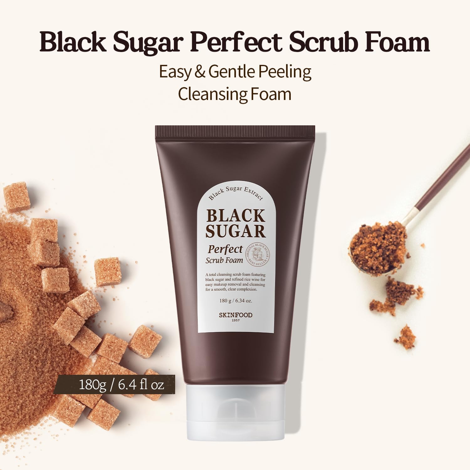 - Fine black sugar granules gently remove impurities while creamy foam soothes any irritation for the perfect cleanse