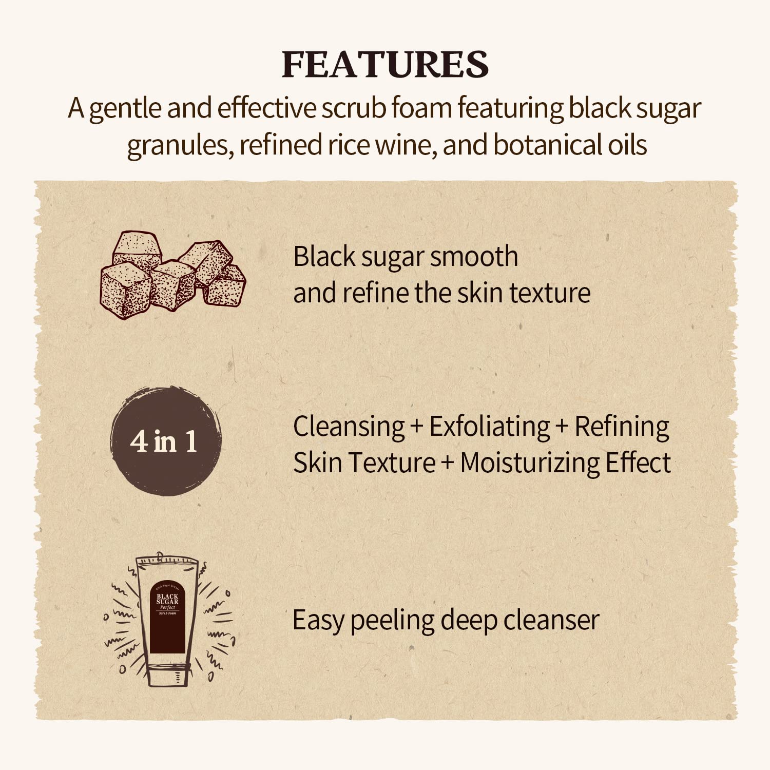 - A gentle creamy scrub foam featuring black sugar granules, refined rice wine, and botanical oils to remove dead skin cells and impurities.